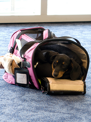 This photo was taken a couple of years ago at Dallas Fort Worth International Airport, and although the angel on my right shoulder compels me to point out that your carrier needs to be closed at all times when you’re inside an airport, the devil on my left shoulder loves having a good look at this beautiful and laid-back doxie. Also, please note the excellent drawing on the ID tag!