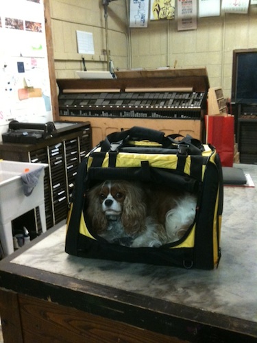 This is the first time I took Chloe to the studio with me, and it made the day extra pleasant to look over from time to time and see her snoozing (the debris on letterpress studio floors includes lead particles, so it was safer for her to be off the ground and tethered to her carrier).